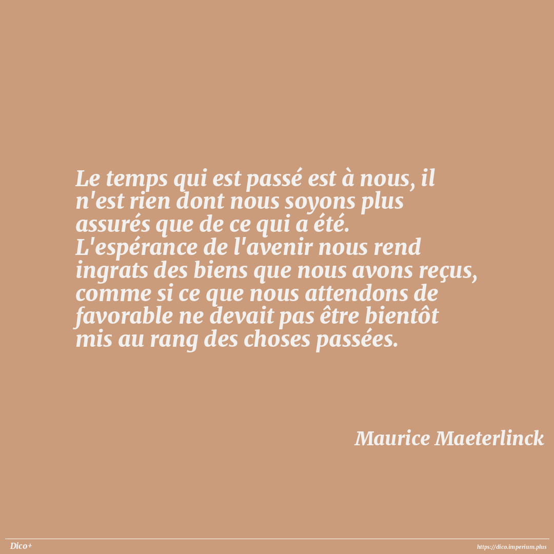 Le temps qui est passé est à nous, il n'est rien dont nous soyons plus assurés que de ce qui a été. L'espérance de l'avenir nous rend ingrats des biens que nous avons reçus, comme si ce que nous attendons de favorable ne devait pas être bientôt mis au rang des choses passées.