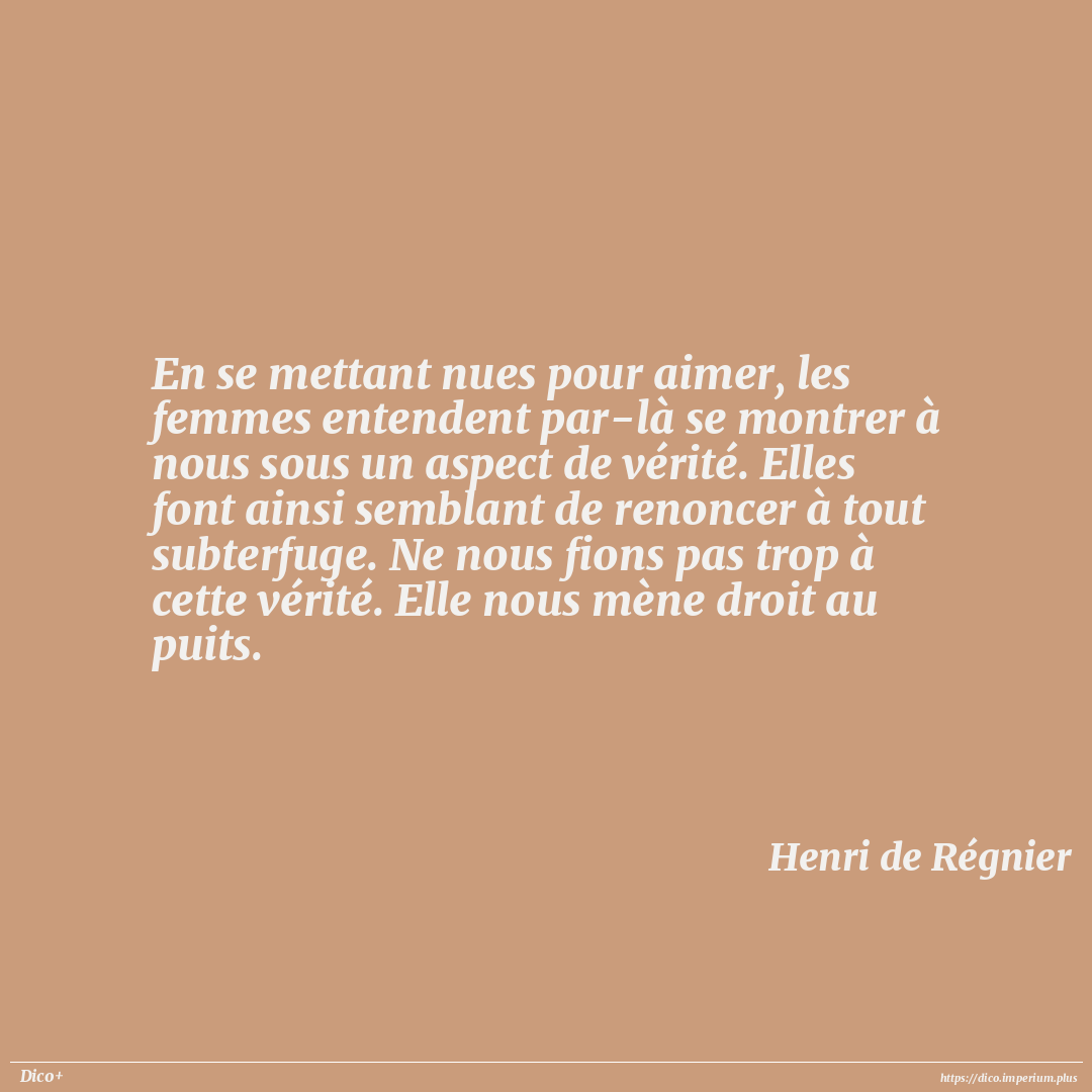 En se mettant nues pour aimer, les femmes entendent par-là se montrer à nous sous un aspect de vérité. Elles font ainsi semblant de renoncer à tout subterfuge. Ne nous fions pas trop à cette vérité. Elle nous mène droit au puits.