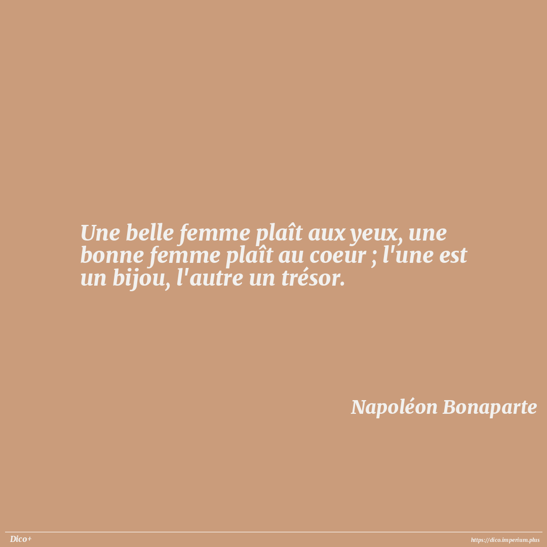 Une belle femme plaît aux yeux, une bonne femme plaît au coeur ; l'une est un bijou, l'autre un trésor.