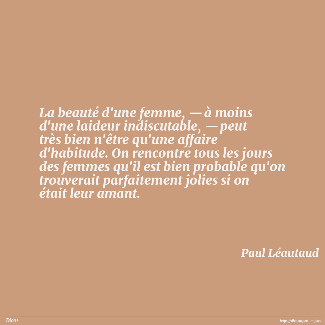 La beauté d'une femme, — à moins d'une laideur indiscutable, — peut très bien n'être qu'une affaire d'habitude. On rencontre tous les jours des femmes qu'il est bien probable qu'on trouverait parfaitement jolies si on était leur amant.