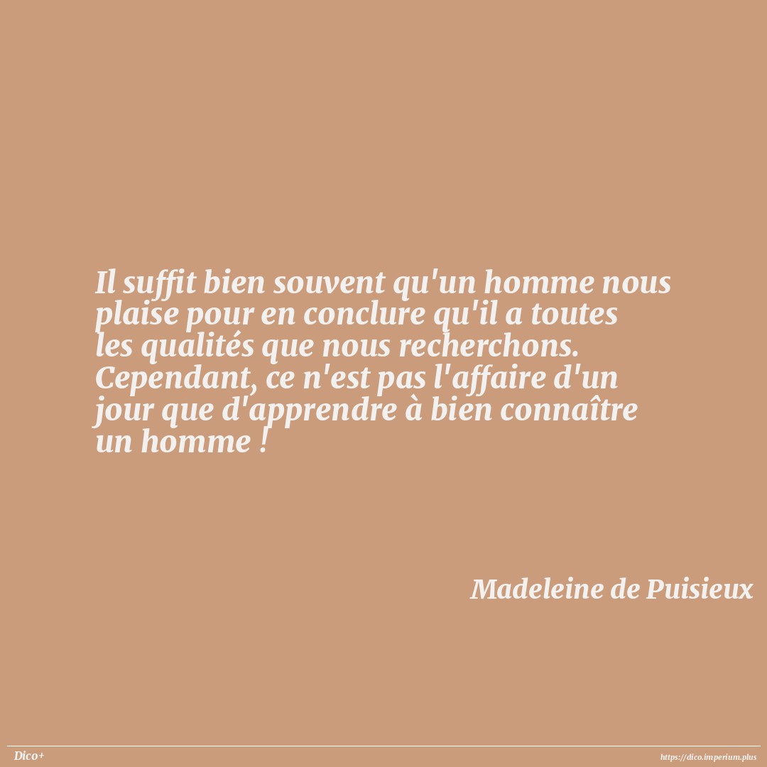 Il suffit bien souvent qu'un homme nous plaise pour en conclure qu'il a toutes les qualités que nous recherchons. Cependant, ce n'est pas l'affaire d'un jour que d'apprendre à bien connaître un homme !