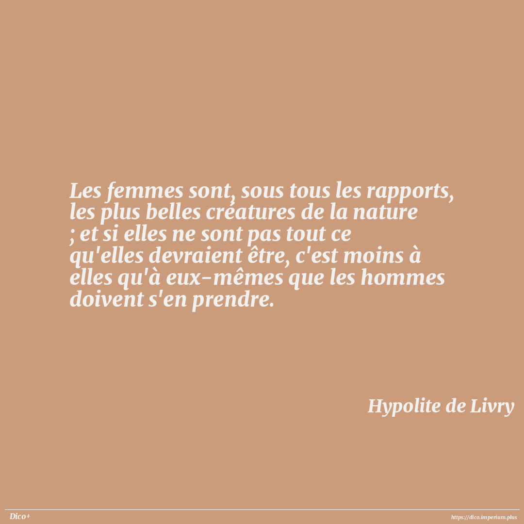 Les femmes sont, sous tous les rapports, les plus belles créatures de la nature ; et si elles ne sont pas tout ce qu'elles devraient être, c'est moins à elles qu'à eux-mêmes que les hommes doivent s'en prendre.