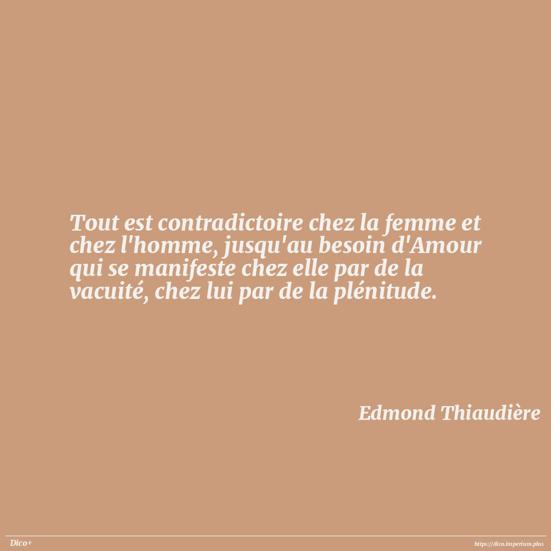 Tout est contradictoire chez la femme et chez l'homme, jusqu'au besoin d'Amour qui se manifeste chez elle par de la vacuité, chez lui par de la plénitude.