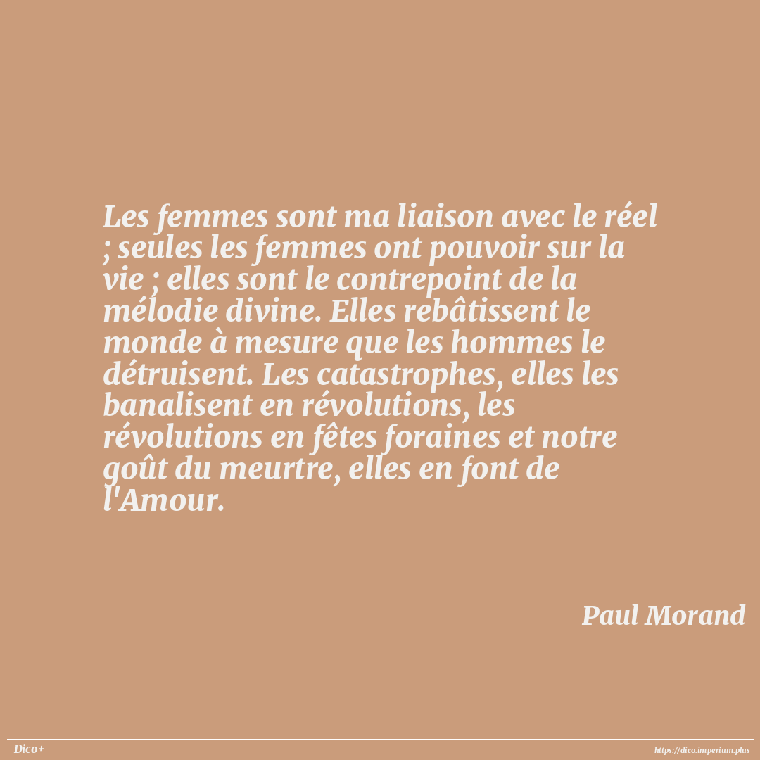 Les femmes sont ma liaison avec le réel ; seules les femmes ont pouvoir sur la vie ; elles sont le contrepoint de la mélodie divine. Elles rebâtissent le monde à mesure que les hommes le détruisent. Les catastrophes, elles les banalisent en révolutions, les révolutions en fêtes foraines et notre goût du meurtre, elles en font de l'Amour.