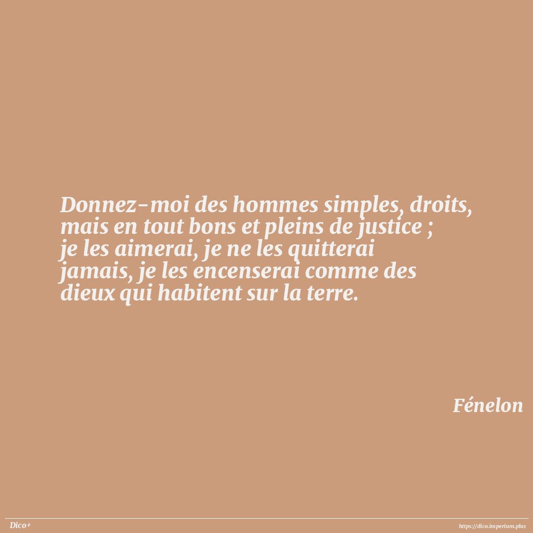Donnez-moi des hommes simples, droits, mais en tout bons et pleins de justice ; je les aimerai, je ne les quitterai jamais, je les encenserai comme des dieux qui habitent sur la terre.
