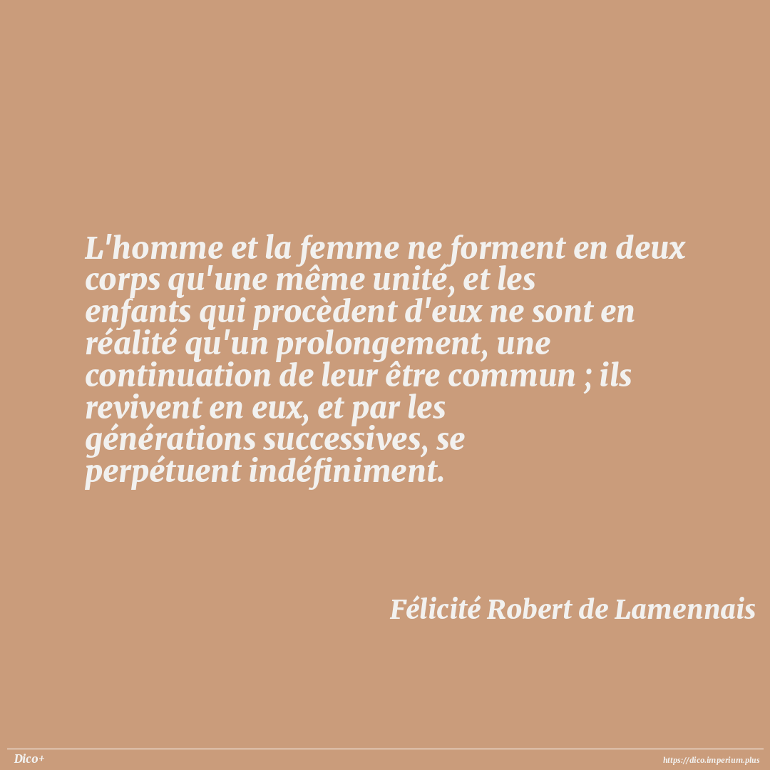 L'homme et la femme ne forment en deux corps qu'une même unité, et les enfants qui procèdent d'eux ne sont en réalité qu'un prolongement, une continuation de leur être commun ; ils revivent en eux, et par les générations successives, se perpétuent indéfiniment.