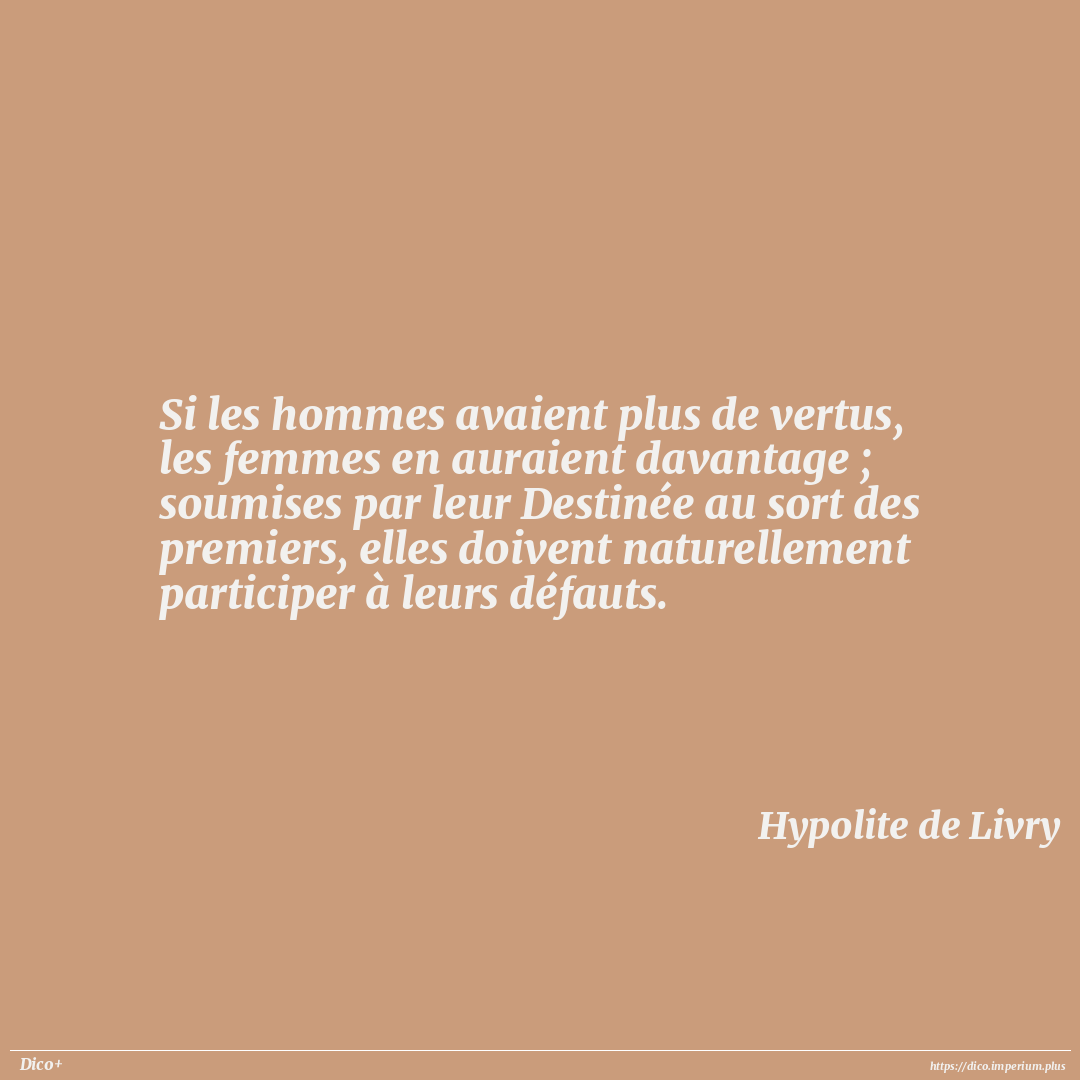 Si les hommes avaient plus de vertus, les femmes en auraient davantage ; soumises par leur Destinée au sort des premiers, elles doivent naturellement participer à leurs défauts.