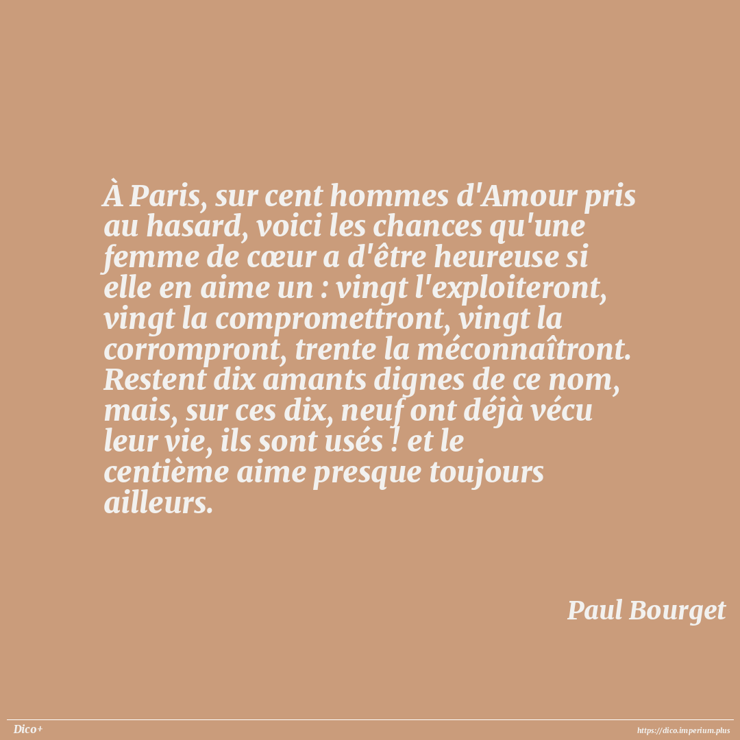 À Paris, sur cent hommes d'Amour pris au hasard, voici les chances qu'une femme de cœur a d'être heureuse si elle en aime un : vingt l'exploiteront, vingt la compromettront, vingt la corrompront, trente la méconnaîtront. Restent dix amants dignes de ce nom, mais, sur ces dix, neuf ont déjà vécu leur vie, ils sont usés ! et le centième aime presque toujours ailleurs.