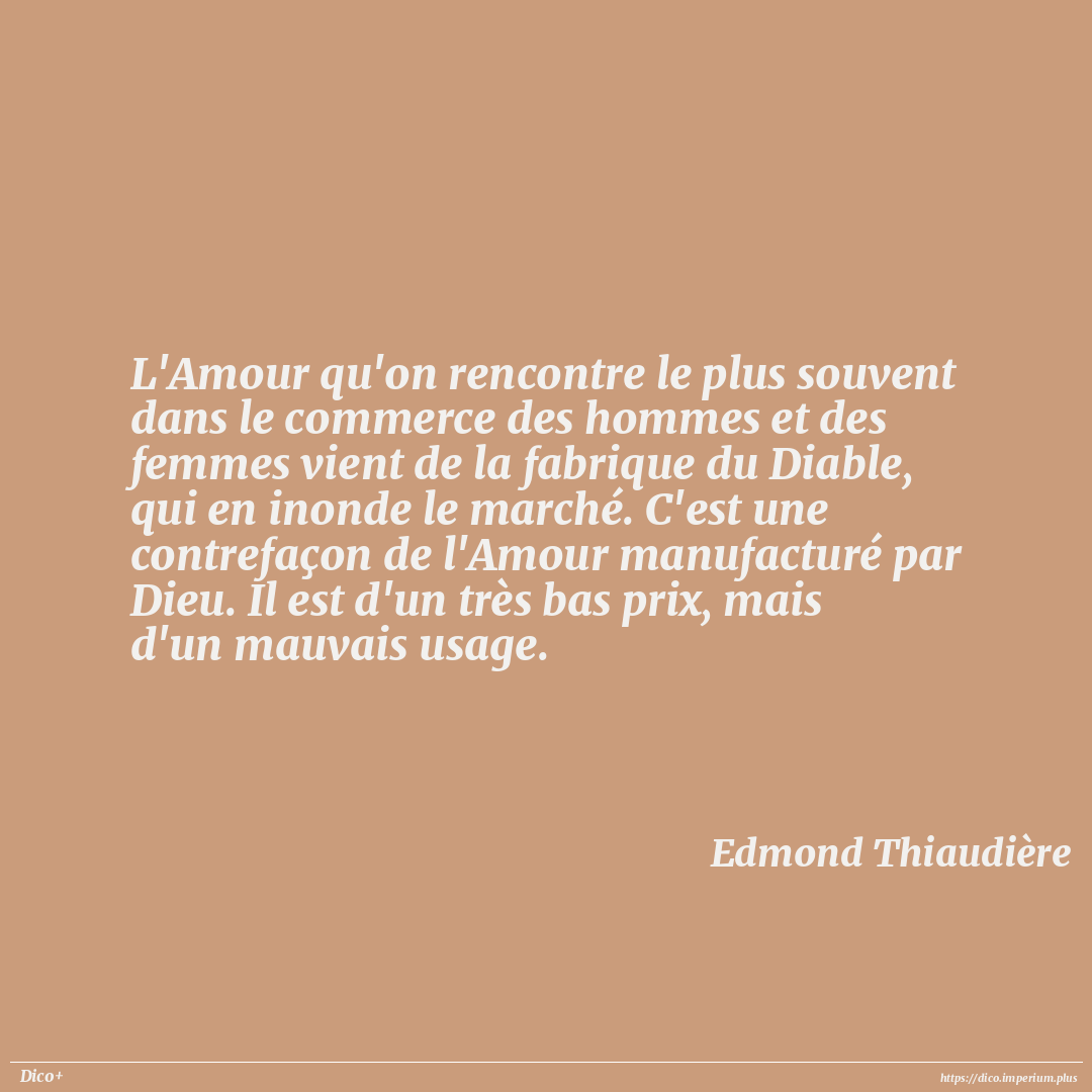 L'Amour qu'on rencontre le plus souvent dans le commerce des hommes et des femmes vient de la fabrique du Diable, qui en inonde le marché. C'est une contrefaçon de l'Amour manufacturé par Dieu. Il est d'un très bas prix, mais d'un mauvais usage.
