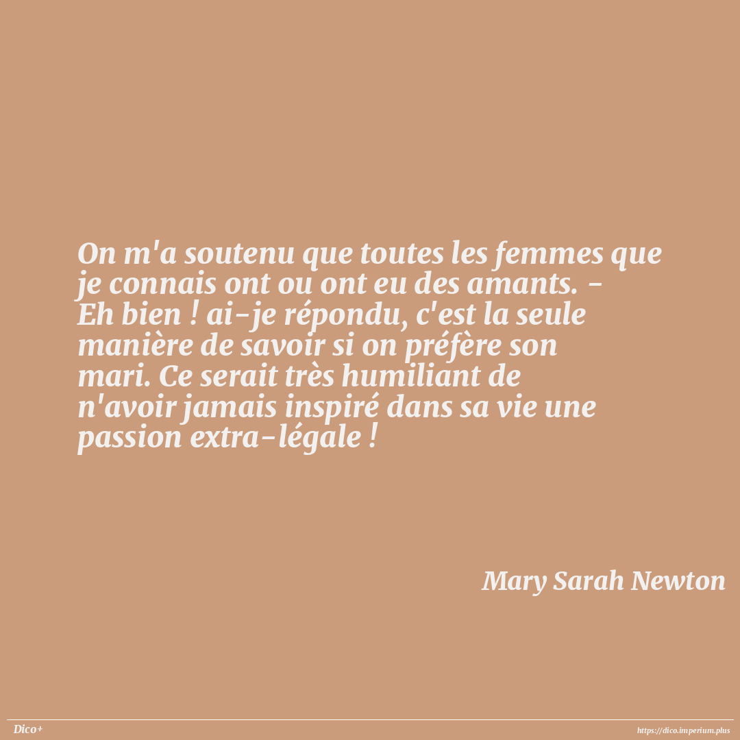 On m'a soutenu que toutes les femmes que je connais ont ou ont eu des amants. - Eh bien ! ai-je répondu, c'est la seule manière de savoir si on préfère son mari. Ce serait très humiliant de n'avoir jamais inspiré dans sa vie une passion extra-légale !