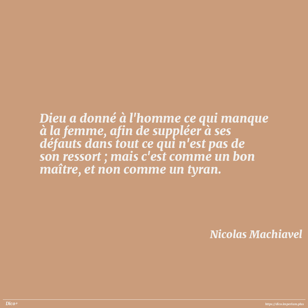 Dieu a donné à l'homme ce qui manque à la femme, afin de suppléer à ses défauts dans tout ce qui n'est pas de son ressort ; mais c'est comme un bon maître, et non comme un tyran.