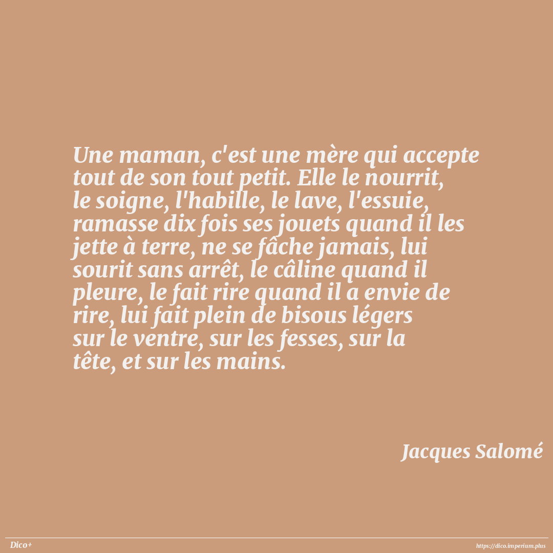 Une maman, c'est une mère qui accepte tout de son tout petit. Elle le nourrit, le soigne, l'habille, le lave, l'essuie, ramasse dix fois ses jouets quand il les jette à terre, ne se fâche jamais, lui sourit sans arrêt, le câline quand il pleure, le fait rire quand il a envie de rire, lui fait plein de bisous légers sur le ventre, sur les fesses, sur la tête, et sur les mains.