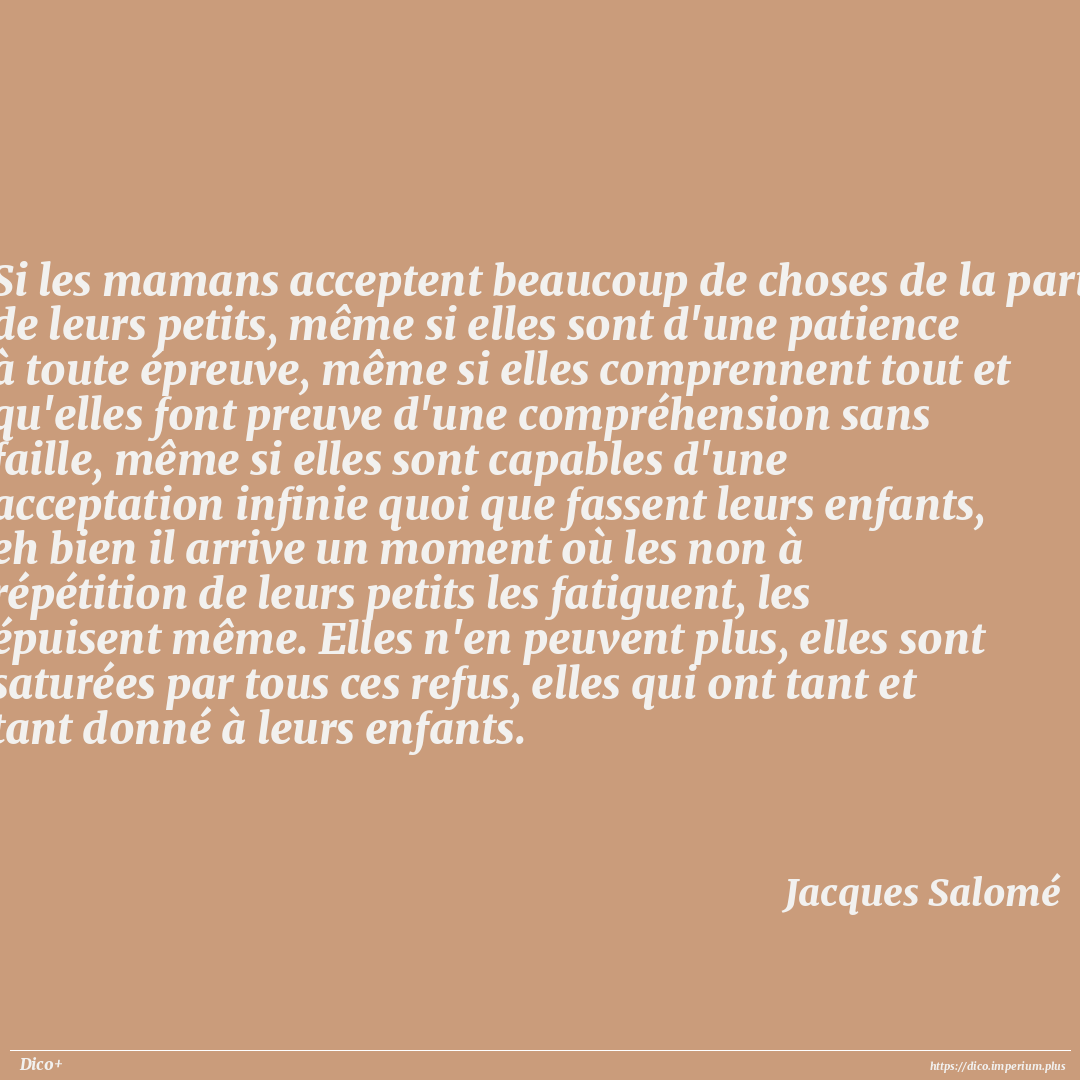 Si les mamans acceptent beaucoup de choses de la part de leurs petits, même si elles sont d'une patience à toute épreuve, même si elles comprennent tout et qu'elles font preuve d'une compréhension sans faille, même si elles sont capables d'une acceptation infinie quoi que fassent leurs enfants, eh bien il arrive un moment où les non à répétition de leurs petits les fatiguent, les épuisent même. Elles n'en peuvent plus, elles sont saturées par tous ces refus, elles qui ont tant et tant donné à leurs enfants.