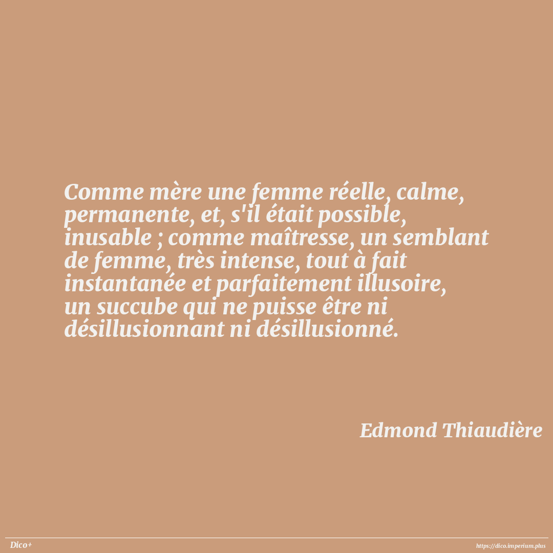 Comme mère une femme réelle, calme, permanente, et, s'il était possible, inusable ; comme maîtresse, un semblant de femme, très intense, tout à fait instantanée et parfaitement illusoire, un succube qui ne puisse être ni désillusionnant ni désillusionné.