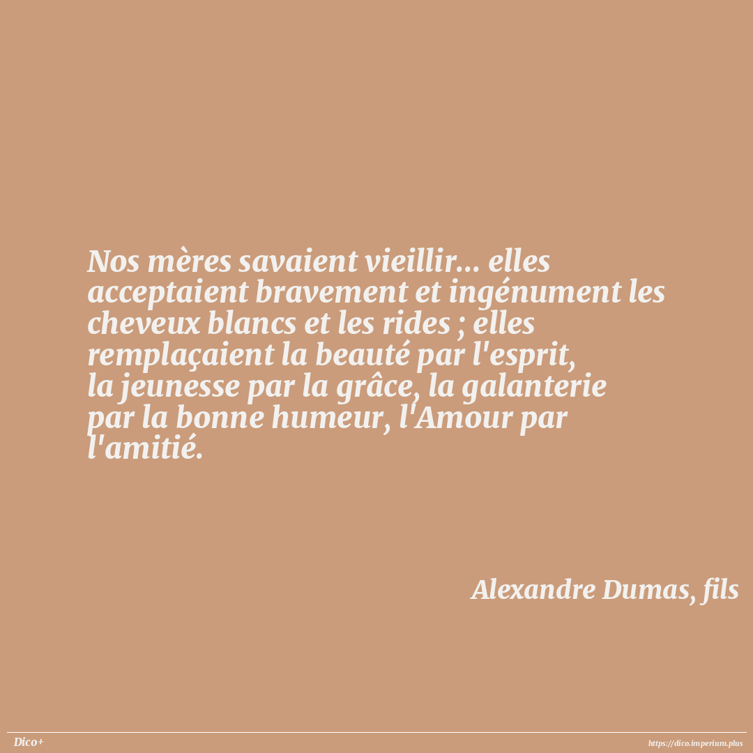 Nos mères savaient vieillir... elles acceptaient bravement et ingénument les cheveux blancs et les rides ; elles remplaçaient la beauté par l'esprit, la jeunesse par la grâce, la galanterie par la bonne humeur, l'Amour par l'amitié.