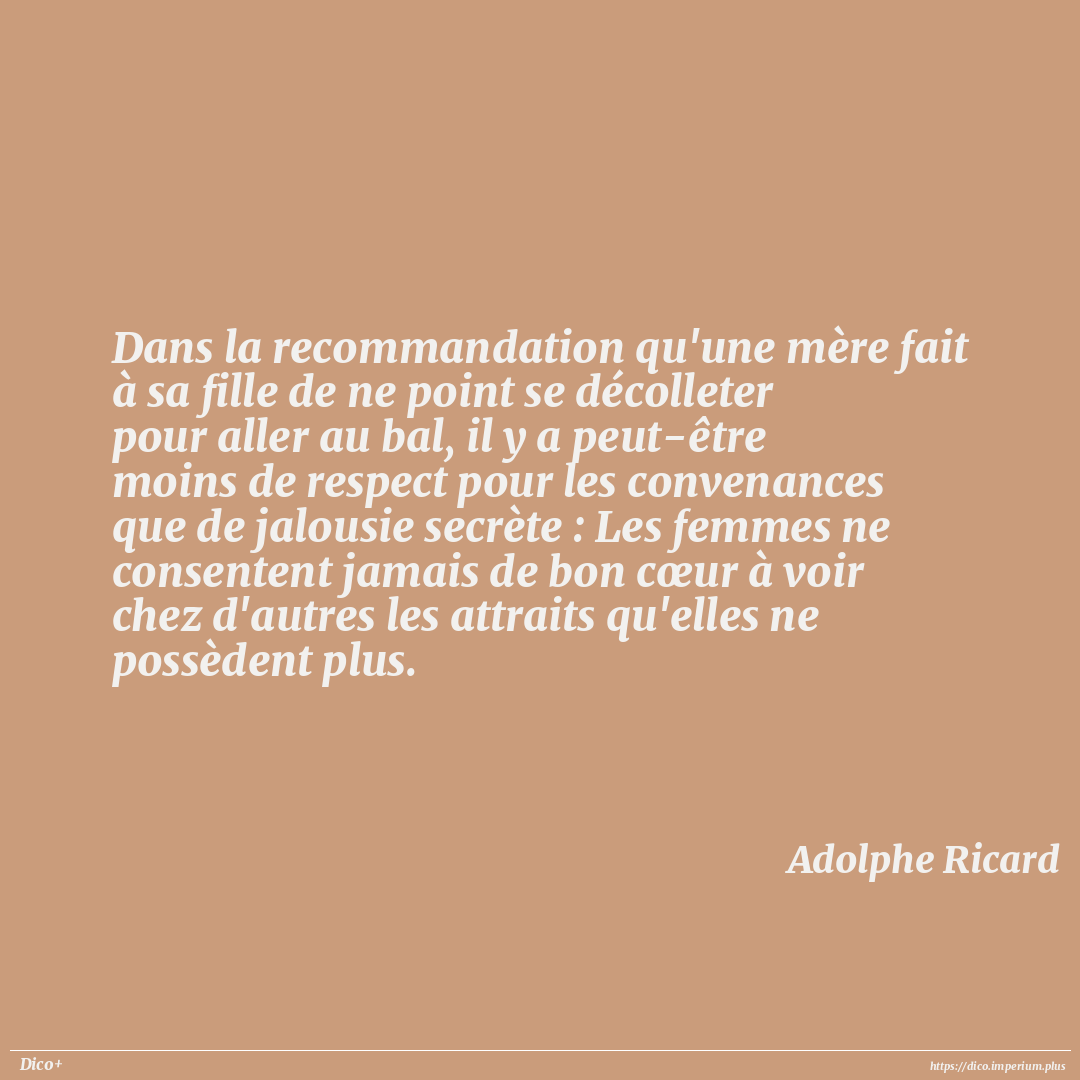 Dans la recommandation qu'une mère fait à sa fille de ne point se décolleter pour aller au bal, il y a peut-être moins de respect pour les convenances que de jalousie secrète : Les femmes ne consentent jamais de bon cœur à voir chez d'autres les attraits qu'elles ne possèdent plus.