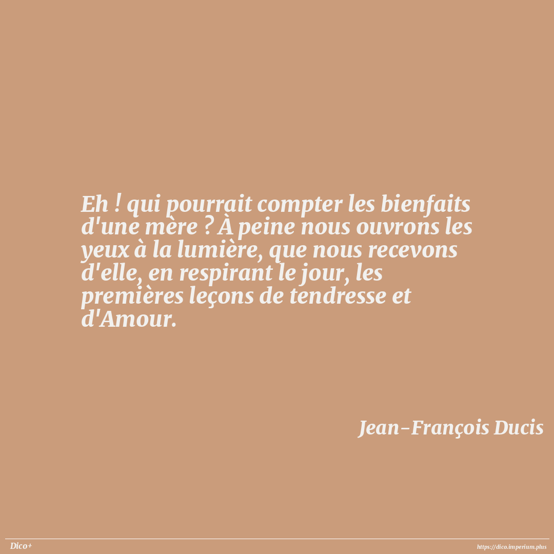 Eh ! qui pourrait compter les bienfaits d'une mère ? À peine nous ouvrons les yeux à la lumière, que nous recevons d'elle, en respirant le jour, les premières leçons de tendresse et d'Amour.