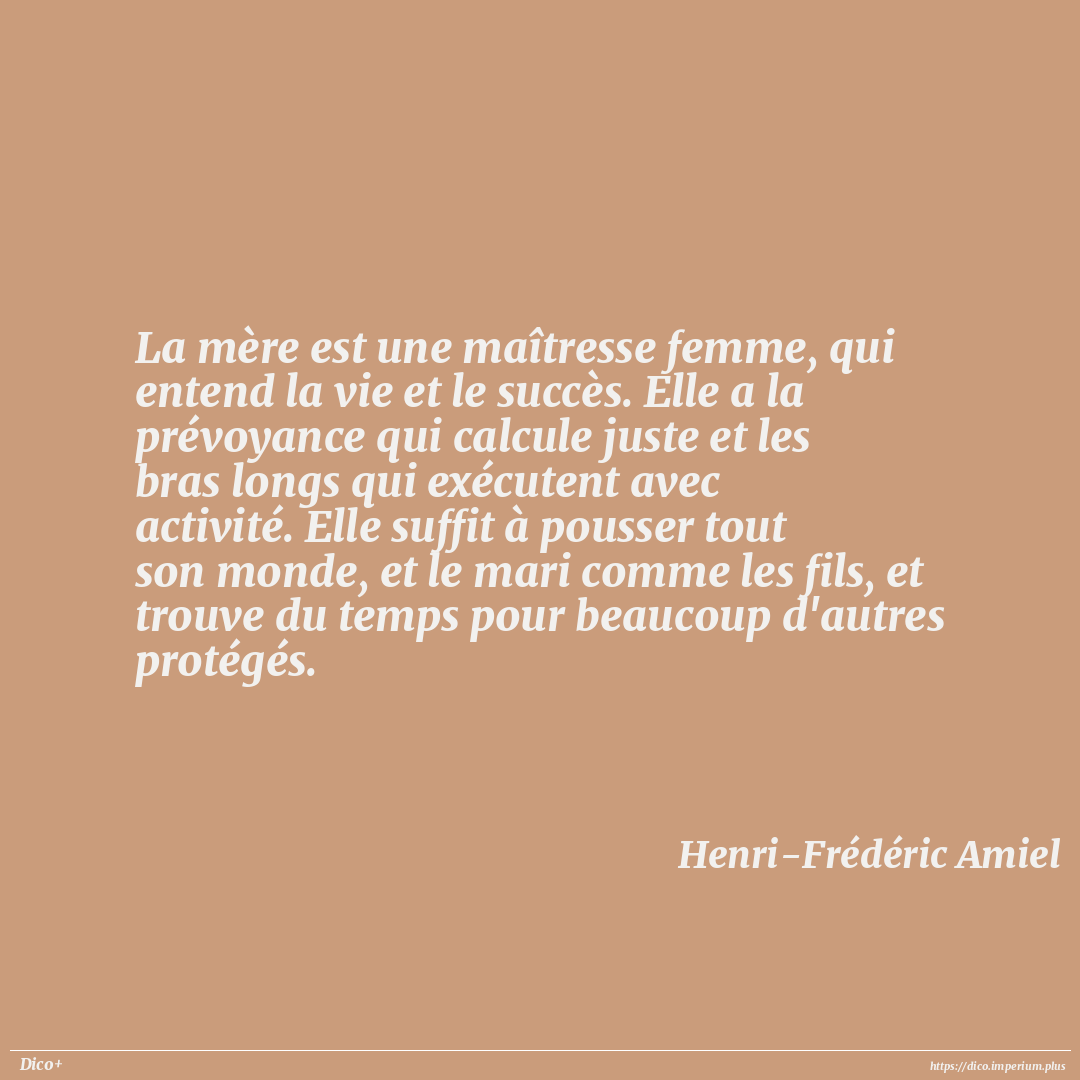 La mère est une maîtresse femme, qui entend la vie et le succès. Elle a la prévoyance qui calcule juste et les bras longs qui exécutent avec activité. Elle suffit à pousser tout son monde, et le mari comme les fils, et trouve du temps pour beaucoup d'autres protégés.