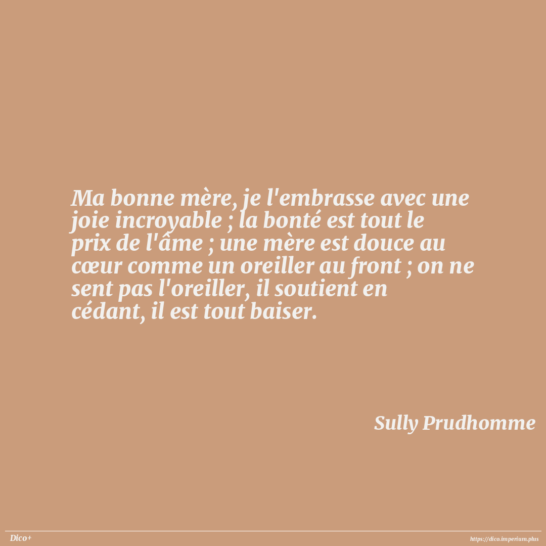 Ma bonne mère, je l'embrasse avec une joie incroyable ; la bonté est tout le prix de l'âme ; une mère est douce au cœur comme un oreiller au front ; on ne sent pas l'oreiller, il soutient en cédant, il est tout baiser.