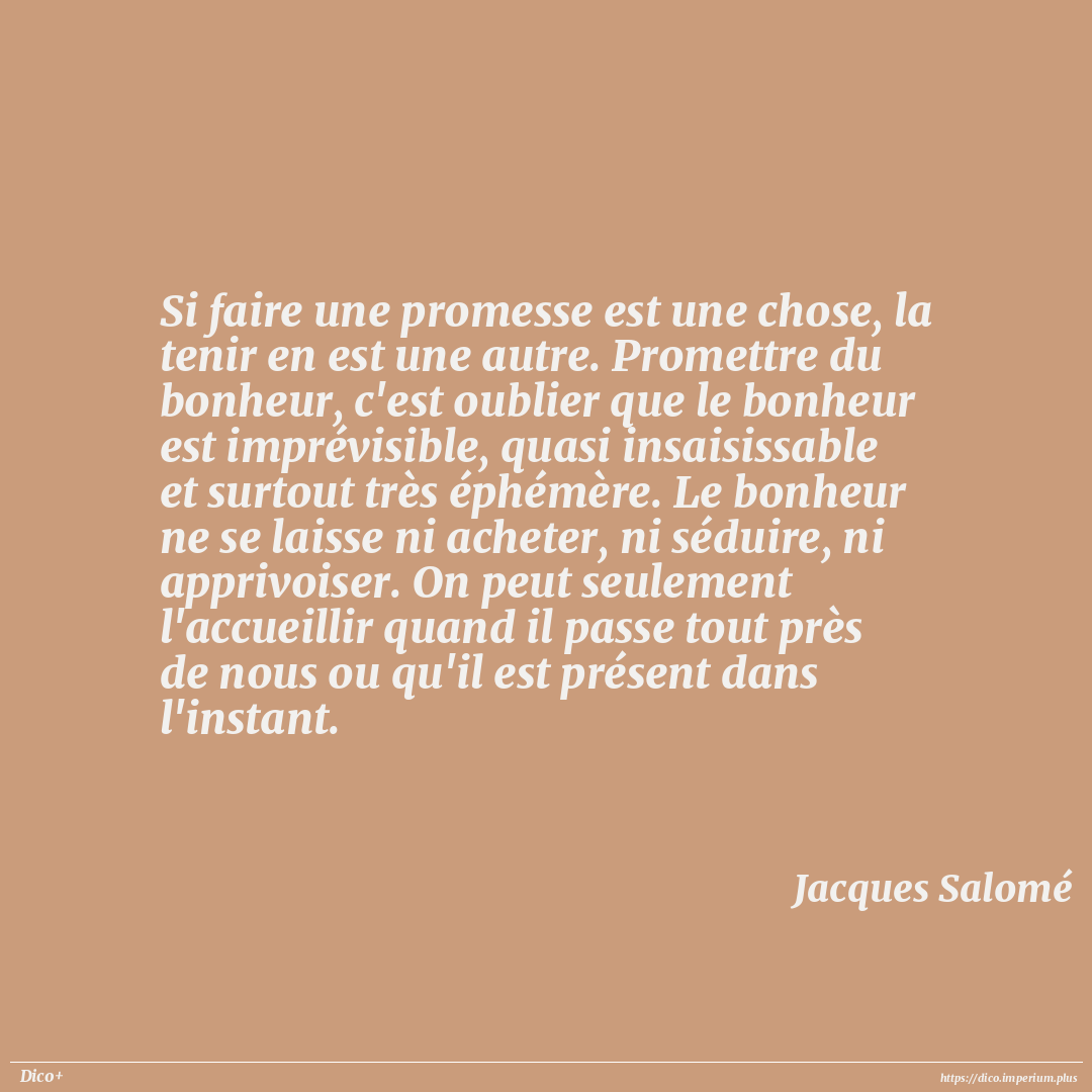 Si faire une promesse est une chose, la tenir en est une autre. Promettre du bonheur, c'est oublier que le bonheur est imprévisible, quasi insaisissable et surtout très éphémère. Le bonheur ne se laisse ni acheter, ni séduire, ni apprivoiser. On peut seulement l'accueillir quand il passe tout près de nous ou qu'il est présent dans l'instant.