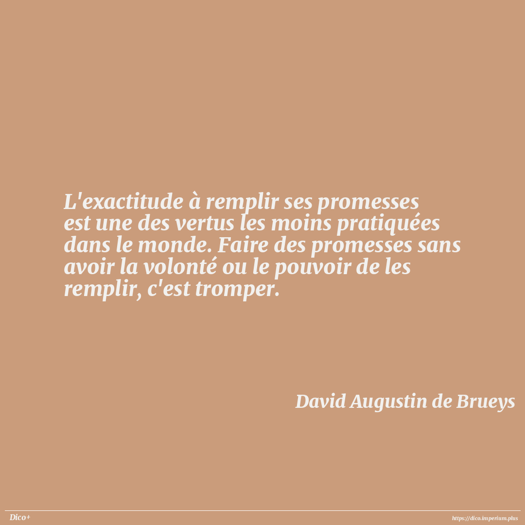 L'exactitude à remplir ses promesses est une des vertus les moins pratiquées dans le monde. Faire des promesses sans avoir la volonté ou le pouvoir de les remplir, c'est tromper.