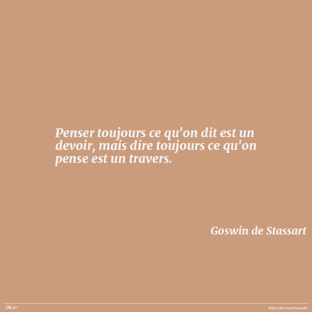 Penser toujours ce qu'on dit est un devoir, mais dire toujours ce qu'on pense est un travers.