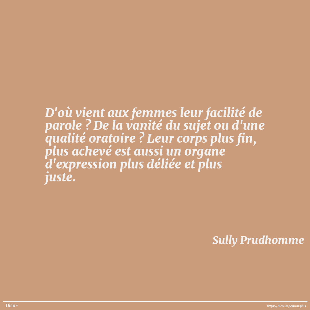 D'où vient aux femmes leur facilité de parole ? De la vanité du sujet ou d'une qualité oratoire ? Leur corps plus fin, plus achevé est aussi un organe d'expression plus déliée et plus juste.