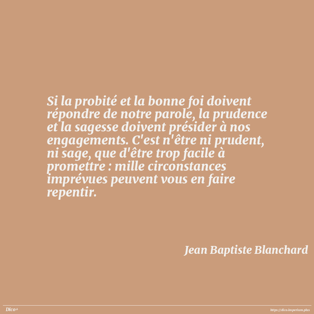Si la probité et la bonne foi doivent répondre de notre parole, la prudence et la sagesse doivent présider à nos engagements. C'est n'être ni prudent, ni sage, que d'être trop facile à promettre : mille circonstances imprévues peuvent vous en faire repentir.