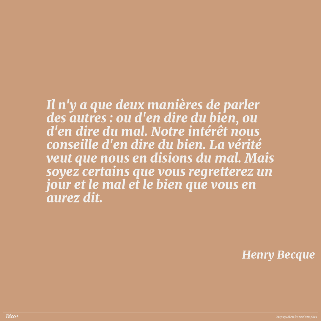 Il n'y a que deux manières de parler des autres : ou d'en dire du bien, ou d'en dire du mal. Notre intérêt nous conseille d'en dire du bien. La vérité veut que nous en disions du mal. Mais soyez certains que vous regretterez un jour et le mal et le bien que vous en aurez dit.