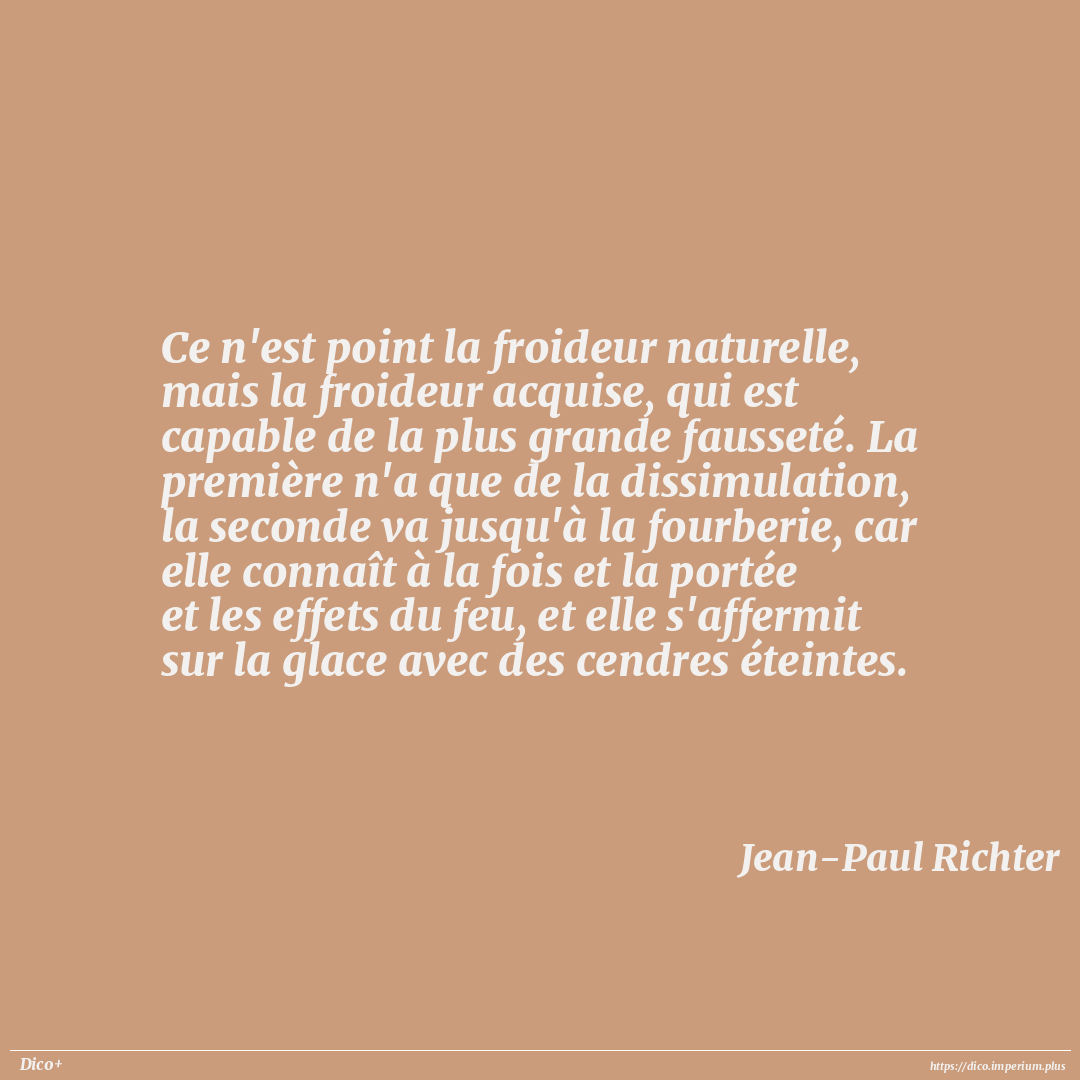 Ce n'est point la froideur naturelle, mais la froideur acquise, qui est capable de la plus grande fausseté. La première n'a que de la dissimulation, la seconde va jusqu'à la fourberie, car elle connaît à la fois et la portée et les effets du feu, et elle s'affermit sur la glace avec des cendres éteintes.