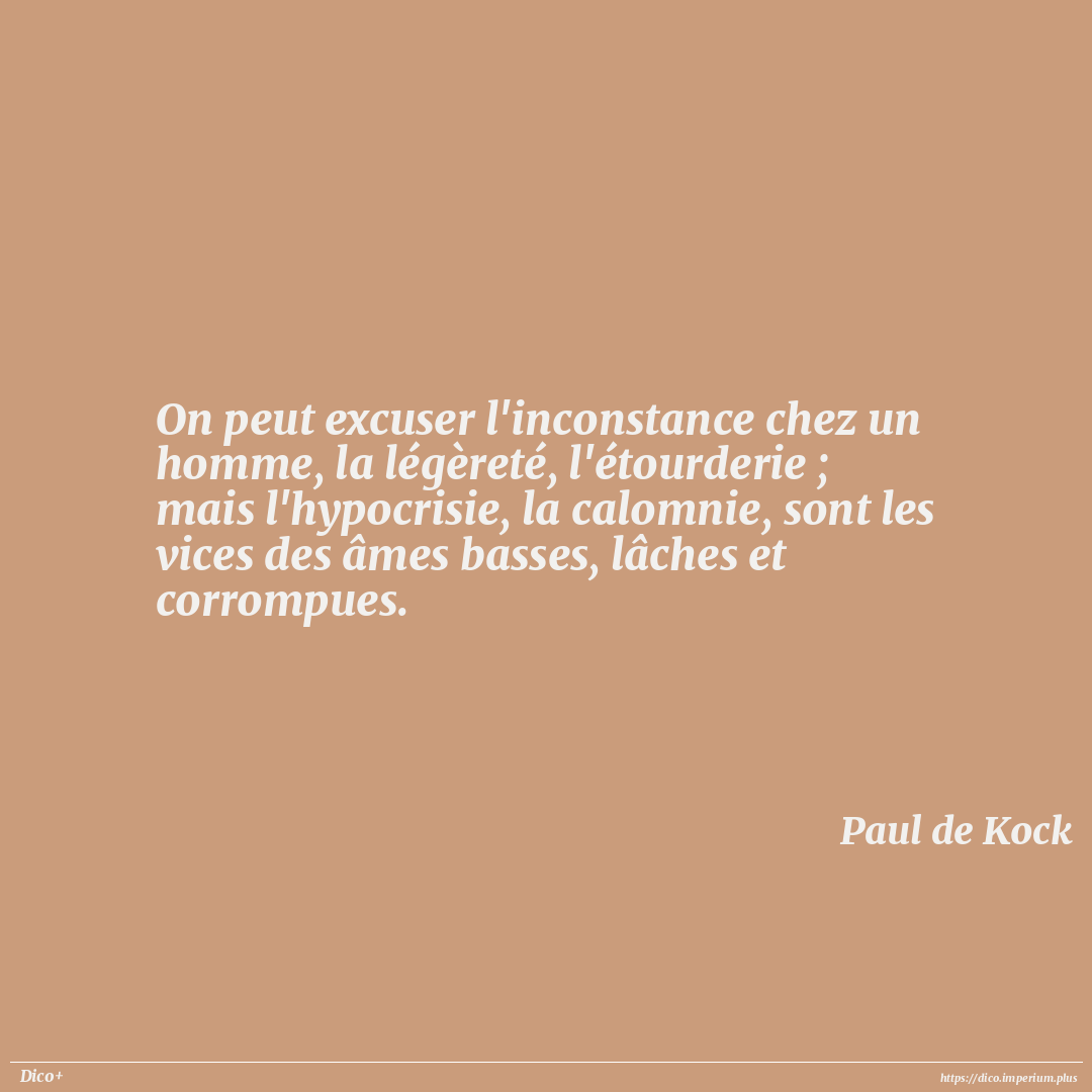 On peut excuser l'inconstance chez un homme, la légèreté, l'étourderie ; mais l'hypocrisie, la calomnie, sont les vices des âmes basses, lâches et corrompues.