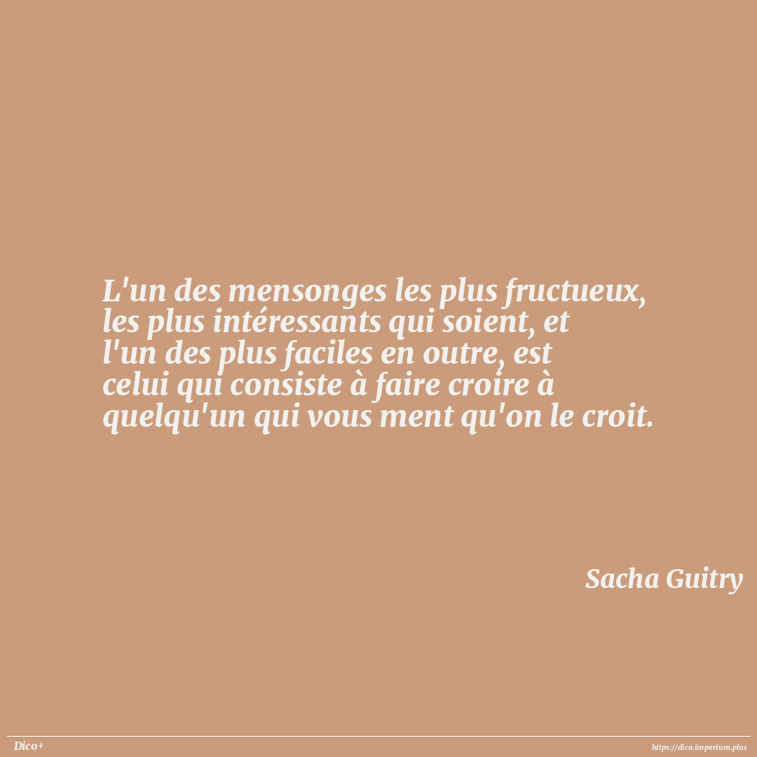 L'un des mensonges les plus fructueux, les plus intéressants qui soient, et l'un des plus faciles en outre, est celui qui consiste à faire croire à quelqu'un qui vous ment qu'on le croit.