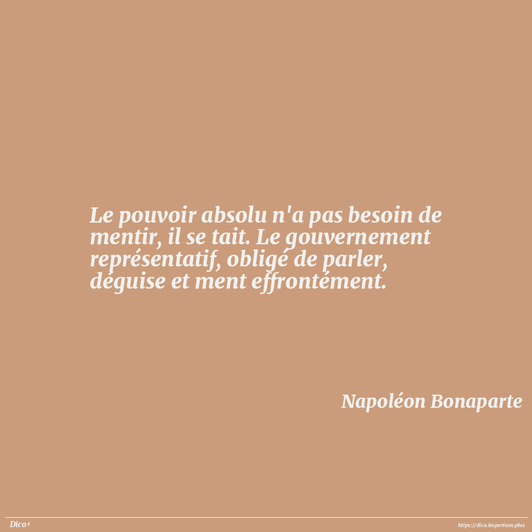 Le pouvoir absolu n'a pas besoin de mentir, il se tait. Le gouvernement représentatif, obligé de parler, déguise et ment effrontément.