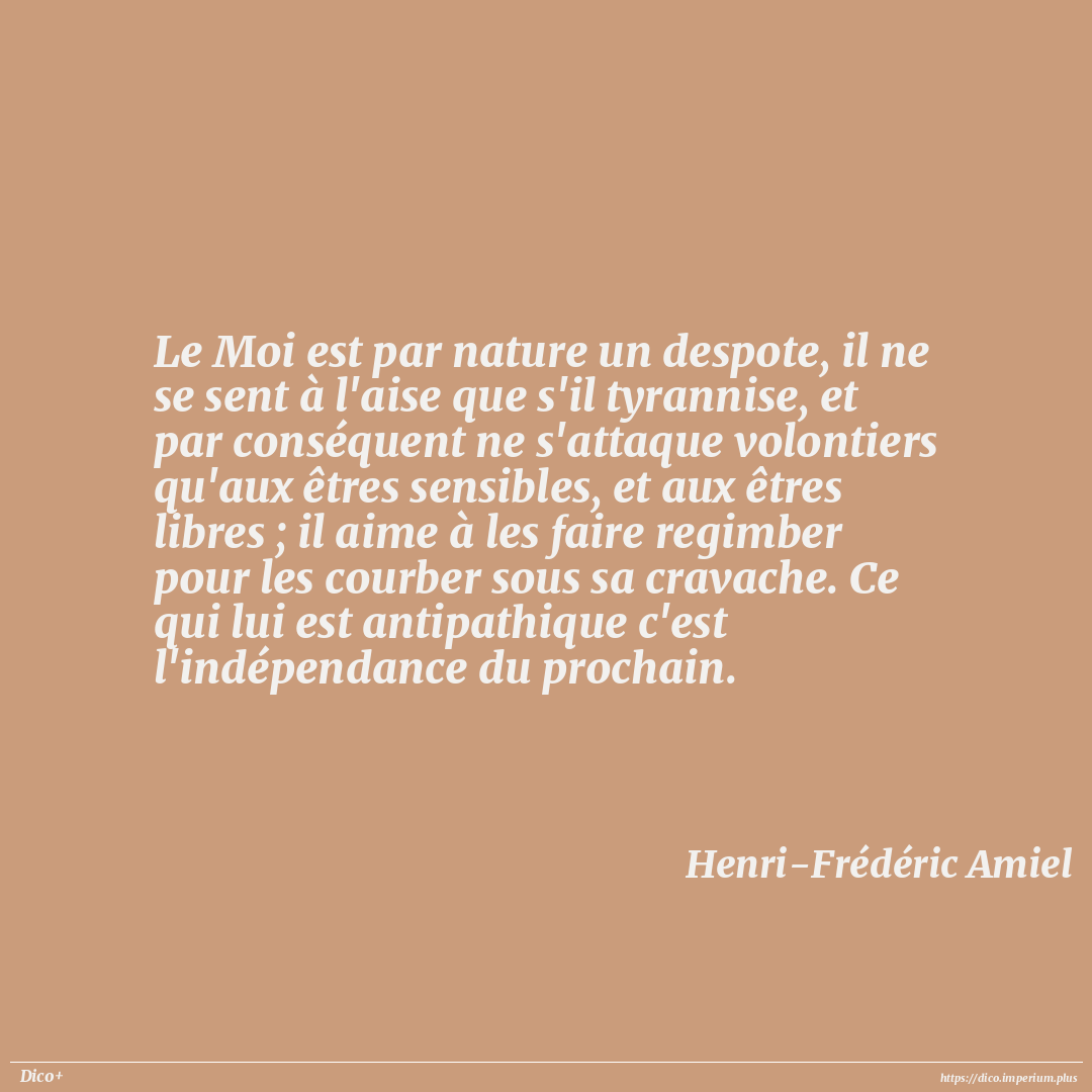 Le Moi est par nature un despote, il ne se sent à l'aise que s'il tyrannise, et par conséquent ne s'attaque volontiers qu'aux êtres sensibles, et aux êtres libres ; il aime à les faire regimber pour les courber sous sa cravache. Ce qui lui est antipathique c'est l'indépendance du prochain.