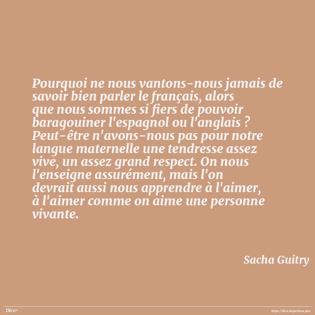 Pourquoi ne nous vantons-nous jamais de savoir bien parler le français, alors que nous sommes si fiers de pouvoir baragouiner l'espagnol ou l'anglais ? Peut-être n'avons-nous pas pour notre langue maternelle une tendresse assez vive, un assez grand respect. On nous l'enseigne assurément, mais l'on devrait aussi nous apprendre à l'aimer, à l'aimer comme on aime une personne vivante.