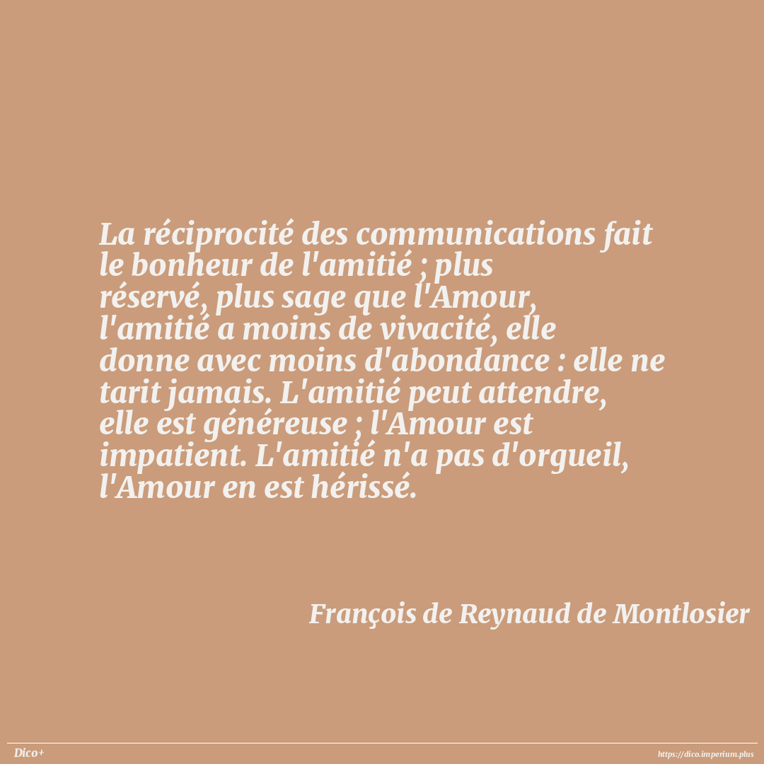 La réciprocité des communications fait le bonheur de l'amitié ; plus réservé, plus sage que l'Amour, l'amitié a moins de vivacité, elle donne avec moins d'abondance : elle ne tarit jamais. L'amitié peut attendre, elle est généreuse ; l'Amour est impatient. L'amitié n'a pas d'orgueil, l'Amour en est hérissé.