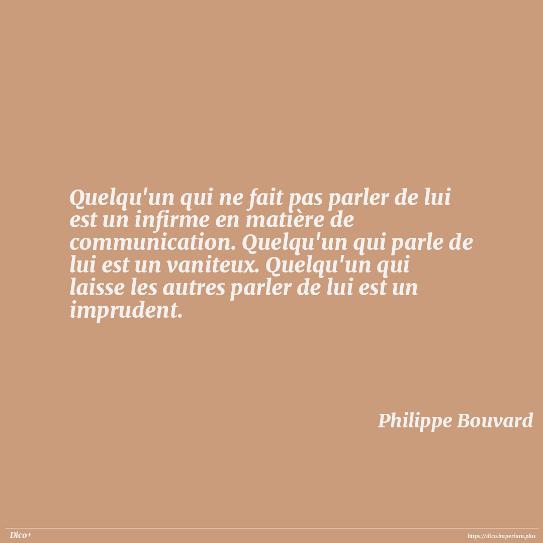 Quelqu'un qui ne fait pas parler de lui est un infirme en matière de communication. Quelqu'un qui parle de lui est un vaniteux. Quelqu'un qui laisse les autres parler de lui est un imprudent.