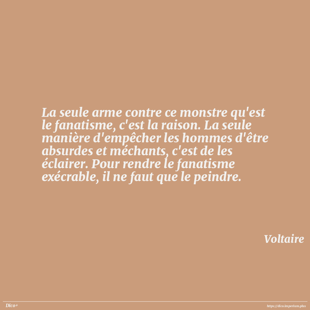 La seule arme contre ce monstre qu'est le fanatisme, c'est la raison. La seule manière d'empêcher les hommes d'être absurdes et méchants, c'est de les éclairer. Pour rendre le fanatisme exécrable, il ne faut que le peindre.