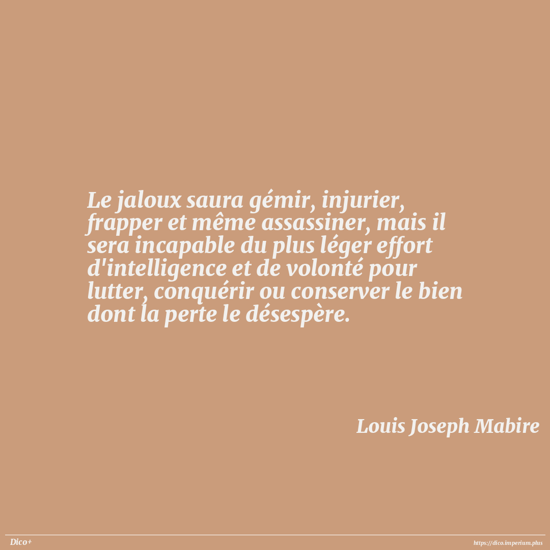 Le jaloux saura gémir, injurier, frapper et même assassiner, mais il sera incapable du plus léger effort d'intelligence et de volonté pour lutter, conquérir ou conserver le bien dont la perte le désespère.