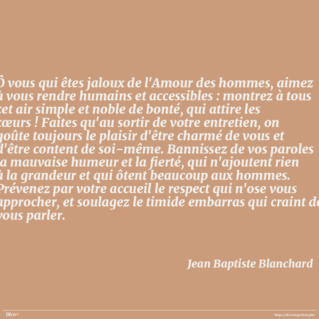 Ô vous qui êtes jaloux de l'Amour des hommes, aimez à vous rendre humains et accessibles : montrez à tous cet air simple et noble de bonté, qui attire les cœurs ! Faites qu'au sortir de votre entretien, on goûte toujours le plaisir d'être charmé de vous et d'être content de soi-même. Bannissez de vos paroles la mauvaise humeur et la fierté, qui n'ajoutent rien à la grandeur et qui ôtent beaucoup aux hommes. Prévenez par votre accueil le respect qui n'ose vous approcher, et soulagez le timide embarras qui craint de vous parler.