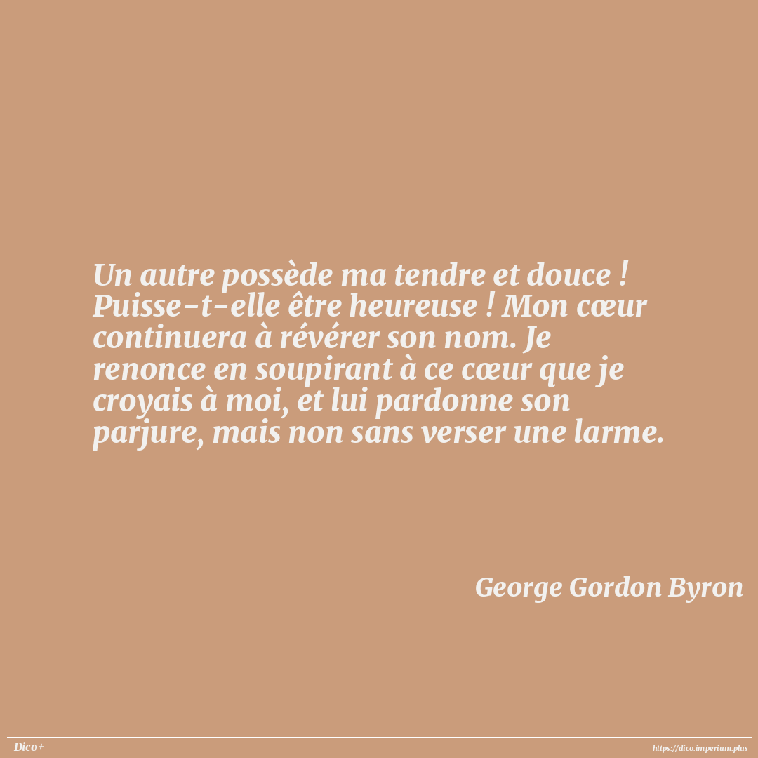 Un autre possède ma tendre et douce ! Puisse-t-elle être heureuse ! Mon cœur continuera à révérer son nom. Je renonce en soupirant à ce cœur que je croyais à moi, et lui pardonne son parjure, mais non sans verser une larme.