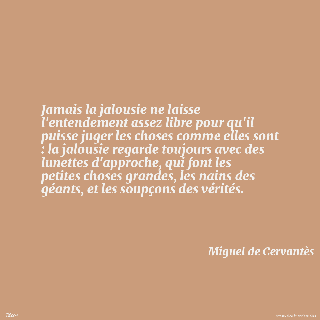 Jamais la jalousie ne laisse l'entendement assez libre pour qu'il puisse juger les choses comme elles sont : la jalousie regarde toujours avec des lunettes d'approche, qui font les petites choses grandes, les nains des géants, et les soupçons des vérités.
