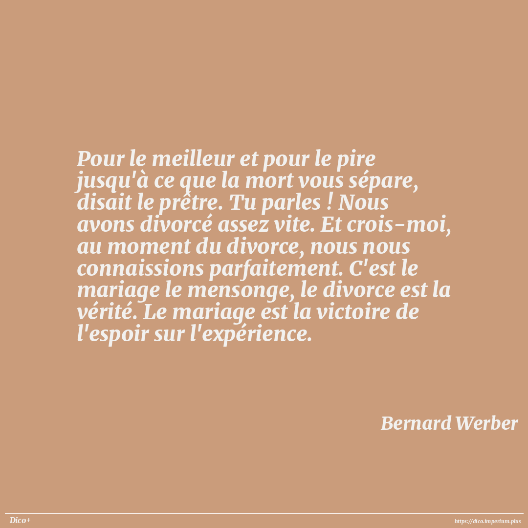Pour le meilleur et pour le pire jusqu'à ce que la mort vous sépare, disait le prêtre. Tu parles ! Nous avons divorcé assez vite. Et crois-moi, au moment du divorce, nous nous connaissions parfaitement. C'est le mariage le mensonge, le divorce est la vérité. Le mariage est la victoire de l'espoir sur l'expérience.
