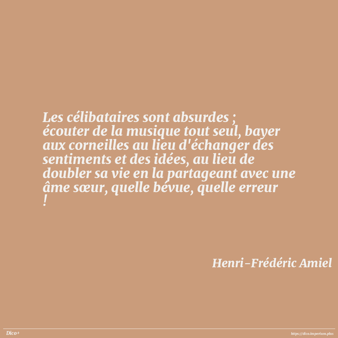 Les célibataires sont absurdes ; écouter de la musique tout seul, bayer aux corneilles au lieu d'échanger des sentiments et des idées, au lieu de doubler sa vie en la partageant avec une âme sœur, quelle bévue, quelle erreur !