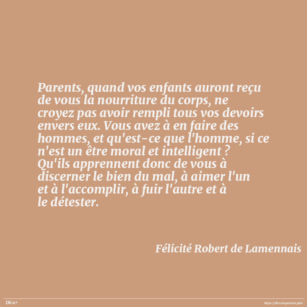 Parents, quand vos enfants auront reçu de vous la nourriture du corps, ne croyez pas avoir rempli tous vos devoirs envers eux. Vous avez à en faire des hommes, et qu'est-ce que l'homme, si ce n'est un être moral et intelligent ? Qu'ils apprennent donc de vous à discerner le bien du mal, à aimer l'un et à l'accomplir, à fuir l'autre et à le détester.