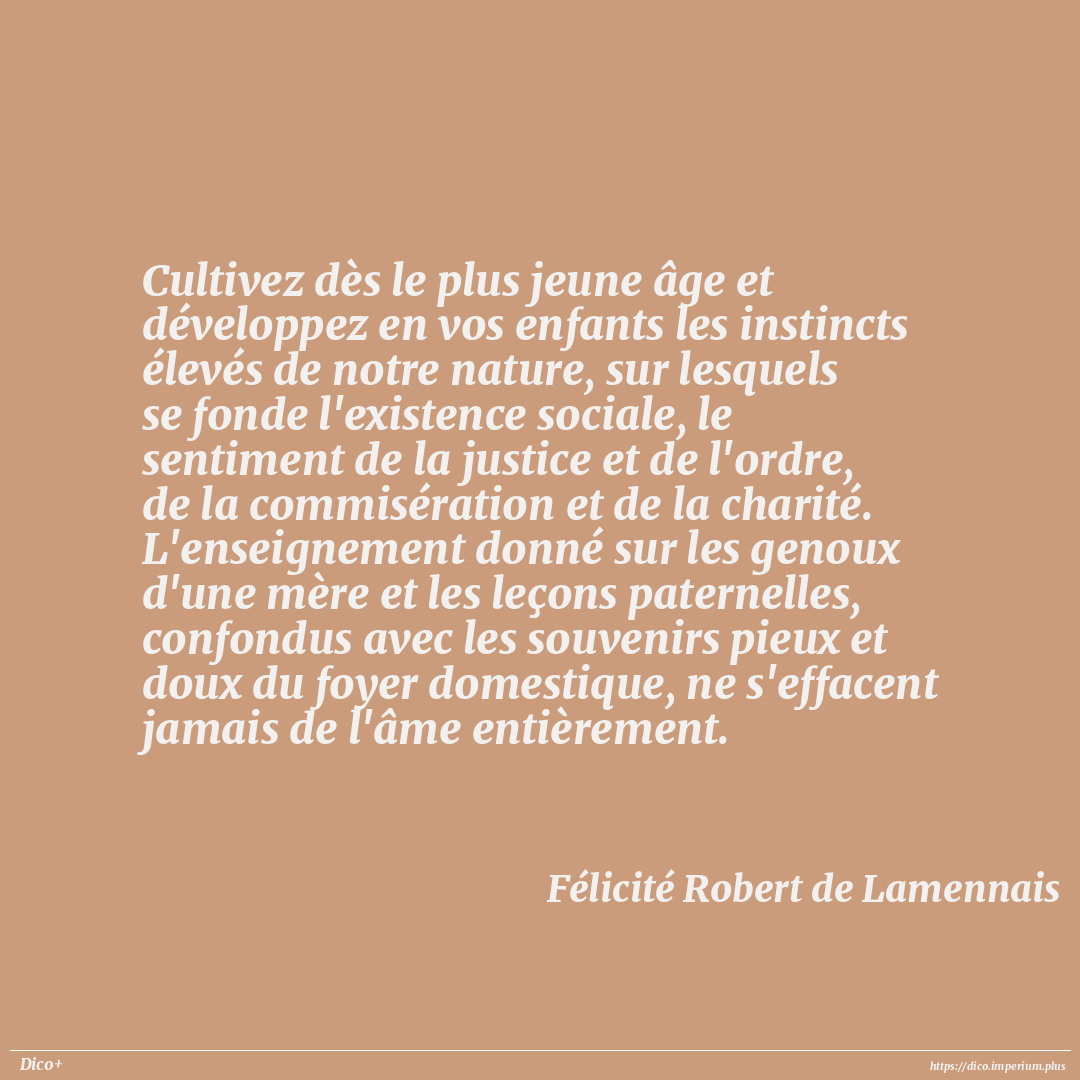 Cultivez dès le plus jeune âge et développez en vos enfants les instincts élevés de notre nature, sur lesquels se fonde l'existence sociale, le sentiment de la justice et de l'ordre, de la commisération et de la charité. L'enseignement donné sur les genoux d'une mère et les leçons paternelles, confondus avec les souvenirs pieux et doux du foyer domestique, ne s'effacent jamais de l'âme entièrement.