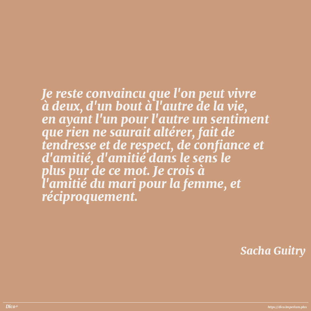 Je reste convaincu que l'on peut vivre à deux, d'un bout à l'autre de la vie, en ayant l'un pour l'autre un sentiment que rien ne saurait altérer, fait de tendresse et de respect, de confiance et d'amitié, d'amitié dans le sens le plus pur de ce mot. Je crois à l'amitié du mari pour la femme, et réciproquement.