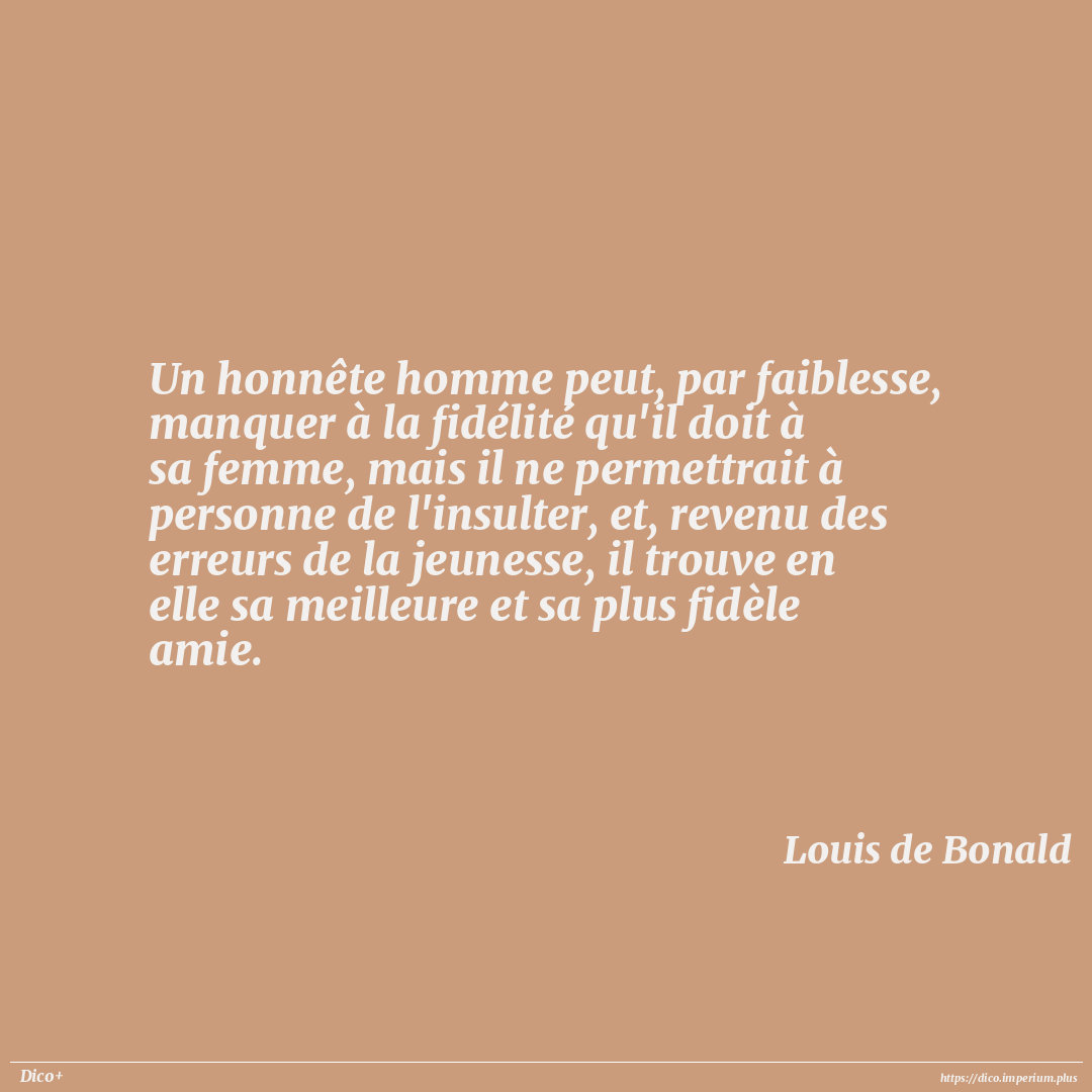 Un honnête homme peut, par faiblesse, manquer à la fidélité qu'il doit à sa femme, mais il ne permettrait à personne de l'insulter, et, revenu des erreurs de la jeunesse, il trouve en elle sa meilleure et sa plus fidèle amie.