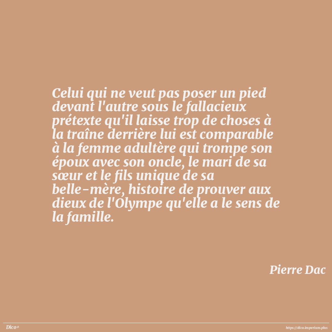 Celui qui ne veut pas poser un pied devant l'autre sous le fallacieux prétexte qu'il laisse trop de choses à la traîne derrière lui est comparable à la femme adultère qui trompe son époux avec son oncle, le mari de sa sœur et le fils unique de sa belle-mère, histoire de prouver aux dieux de l'Olympe qu'elle a le sens de la famille.