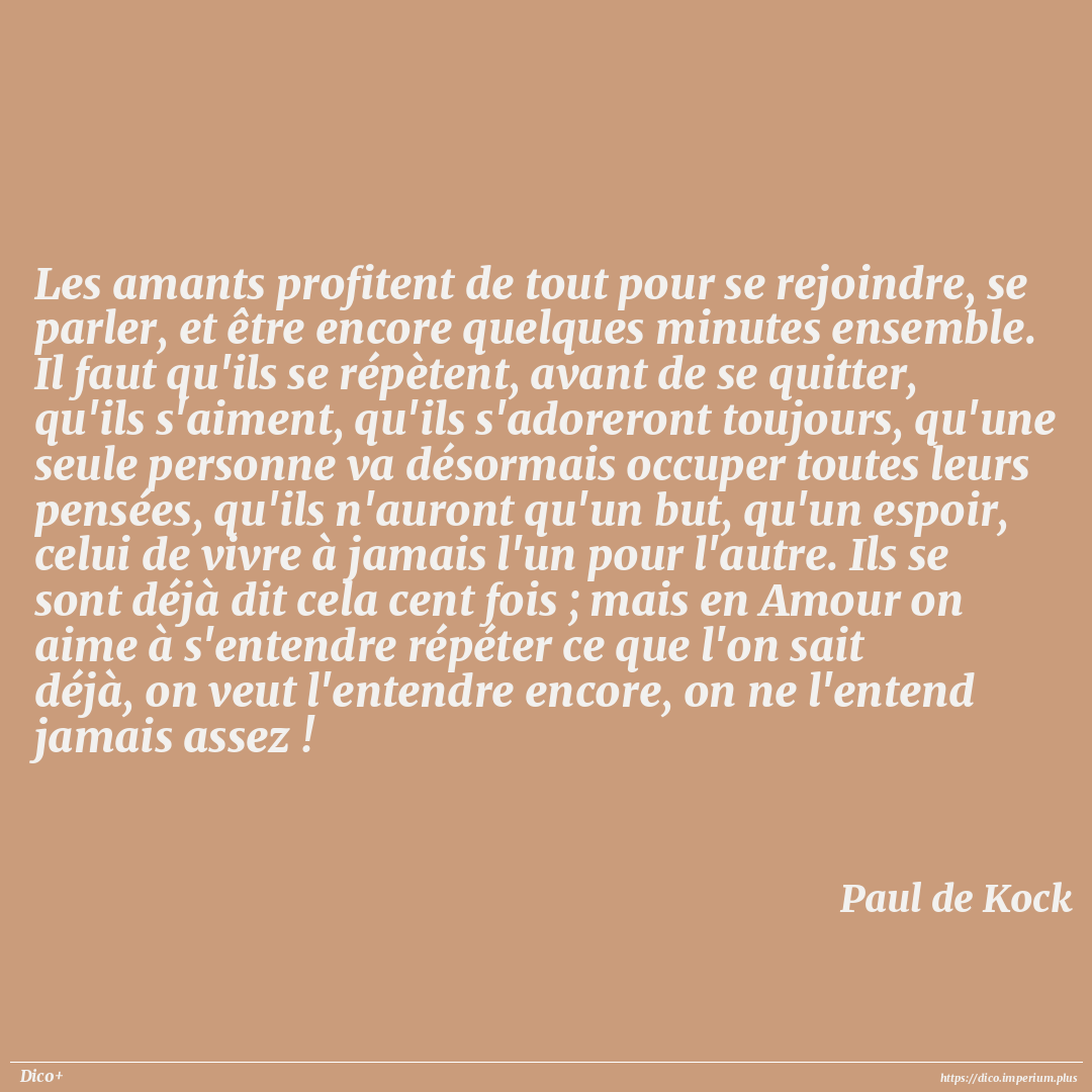 Les amants profitent de tout pour se rejoindre, se parler, et être encore quelques minutes ensemble. Il faut qu'ils se répètent, avant de se quitter, qu'ils s'aiment, qu'ils s'adoreront toujours, qu'une seule personne va désormais occuper toutes leurs pensées, qu'ils n'auront qu'un but, qu'un espoir, celui de vivre à jamais l'un pour l'autre. Ils se sont déjà dit cela cent fois ; mais en Amour on aime à s'entendre répéter ce que l'on sait déjà, on veut l'entendre encore, on ne l'entend jamais assez !